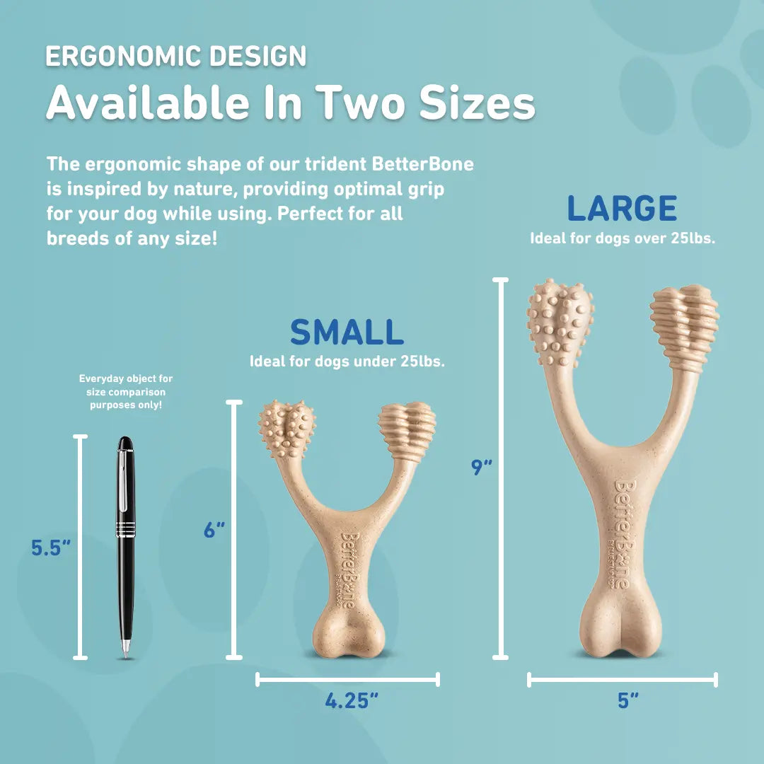 Discover BetterBone CLASSIC,the ultimate chew toy for your dog's enjoyment, health, and safety. Crafted from all-natural, food-grade ingredients, designed to promote health and dental hygiene with a softer and more natural composition compared to nylon, and antlers. Our unique teeth-cleaning ends reach tricky hard-to-clean areas. Pair this with our natural, non-toxic, hypoallergenic, and splinter-resistant composition.