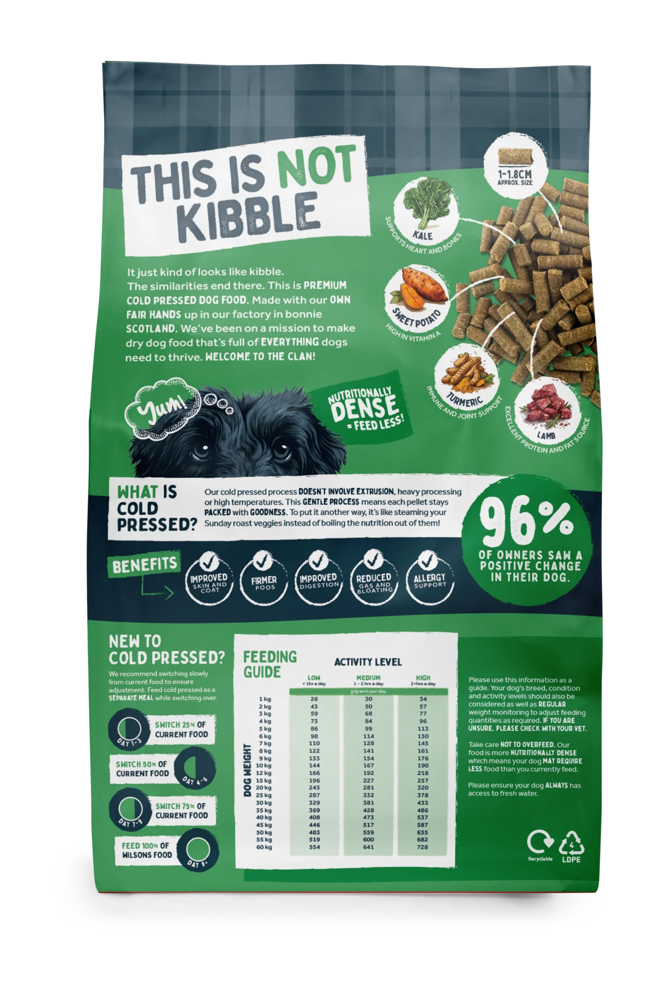 It is important not to over feed, as cold pressed dog food is nutritionally dense you will need to feed around 30% less than traditional kibble. When introducing Wilsons for the first time, ensure you gradually switch over from your previous dog food. Read our feeding guide for more information.