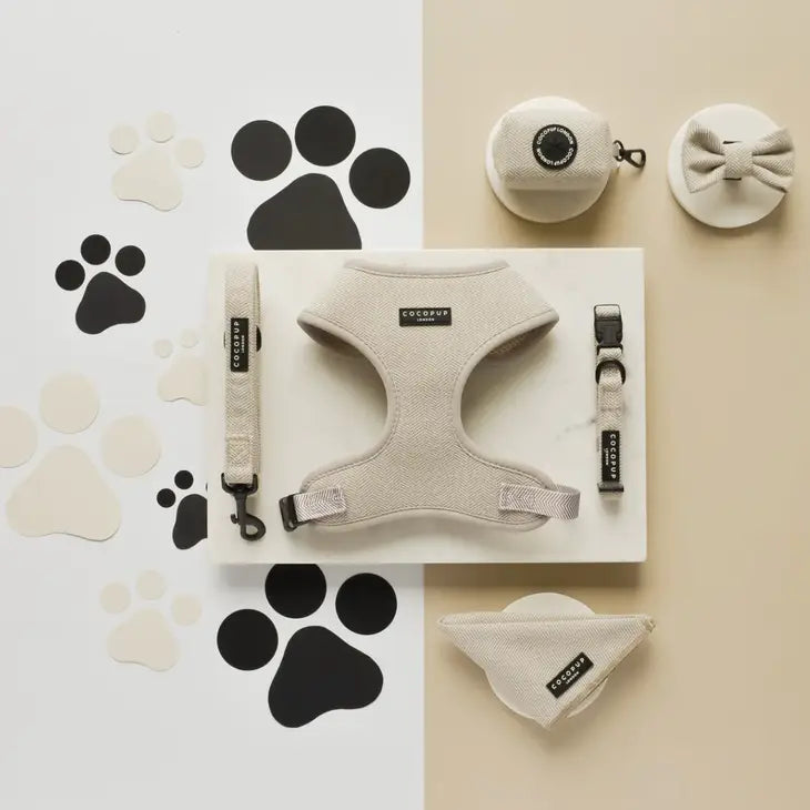 Country bumpkins say hello to our stunning Brown Tweed Adjustable Neck Harness. This herringbone pattern and super soft material make for the most perfect addition to any pupdrobe. Take on walkies in chic country style. Our Adjustable Neck harnesses provide a comfy and stylish alternative to collars. Slide over your pup's head, adjust at the neck and chest, fasten at the side and you'll be "walkies" ready! Black D ring for lead attachment Polyester Material Lightweight and comfortable Fully adjustable chest strap Extra Small: Neck = 29-36cm/ Chest = 35-48cm Small: Neck = 35-43cm/ Chest = 41-54cm Medium: Neck = 39-50cm/ Chest = 46-60cm Large: Neck = 42-55cm/ Chest = 57-80cm **Please note that like all human accessories, dog accessories are subject to wear and tear and it is the responsibility of the owner to keep an eye on the condition to make sure it is safe for their pup to wear