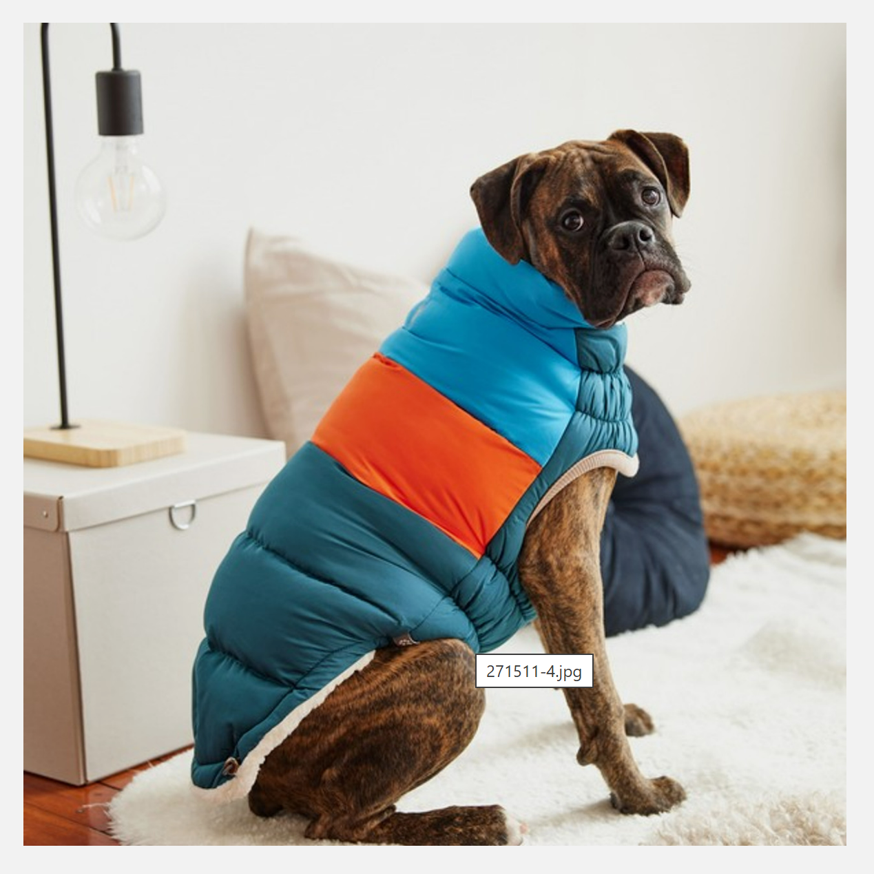 The GF PET® Elasto-Fit® Color Block Puffer is a great choice for active dogs who are looking for the coolest puffy fashion and warm coverage. Its' puffy, down-touch filling and trendy color blocks are a stunning statement of canine vogue! Both country-chic and city-sleek, this gorgeous puffer flaunts sleek and simple lines, GF PET® signature contrast binding, and bold, unisex colors. The Color Block Puffer keeps it real with snuggly warm popcorn sherpa lining and double bungee cord adjusters to sculpt the back end perfectly to your dog.