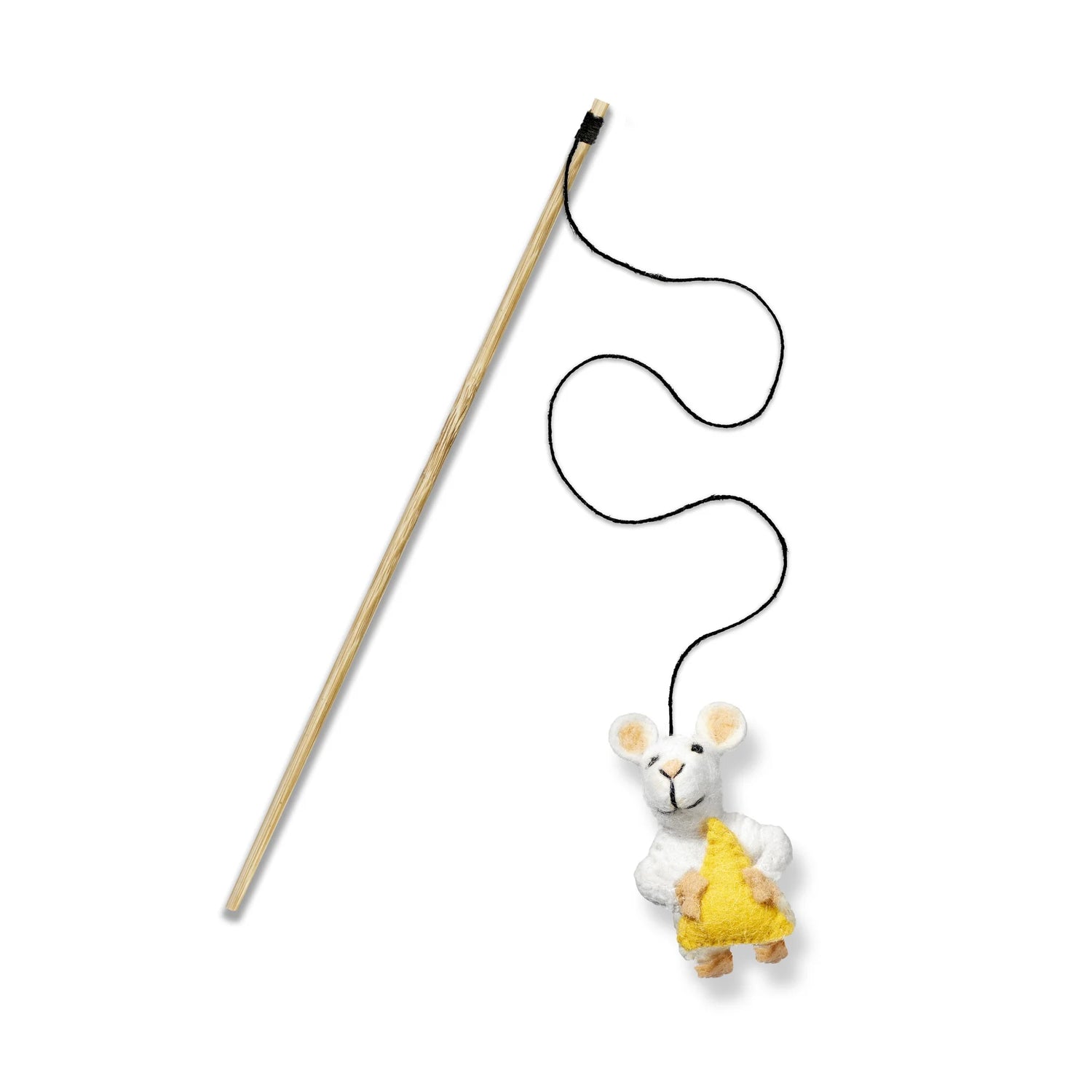 Made with sustainable and natural materials; wool felt, jute string, and a bamboo wood stick. Produced without using any added compound that would harm or be released when chewed.