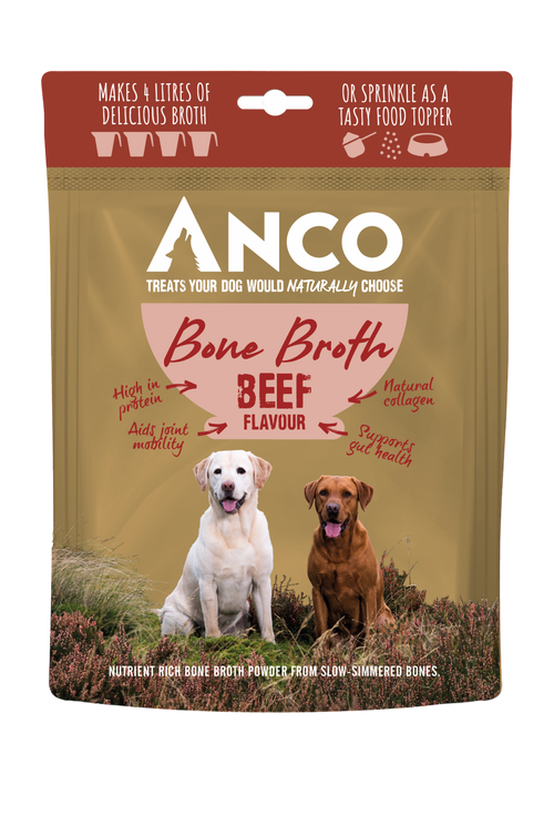 Anco Beef Bone Broth is an incredibly nutritious and versatile food topper for dogs. Packed full of high levels of collagen, calcium, phosphorus, glucosamine, contains essential amino acids etc., all of which provide many health benefits for your dog including helps with strength, reduces inflammation which can help keep joint pain away, improved digestion, healthier skin and coat, the list goes on! Not only is it incredibly tasteful for your dog, it also has many health benefits, why not try some? Your dog will love you for this one!