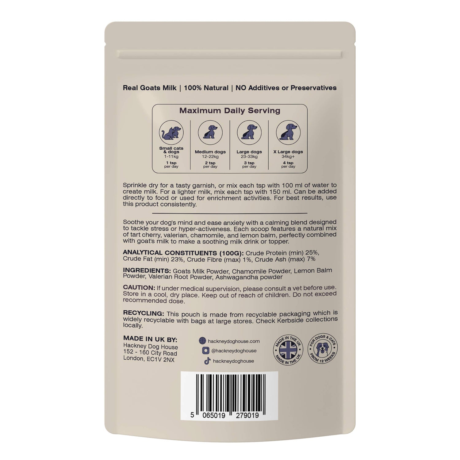 Hackney Dog House Calming Goats Milk Powder for Dogs - Makes Twelve Pints