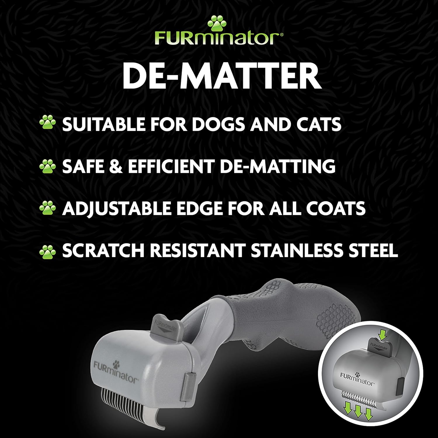 The FURminator® Adjustable deMatting Tool safely and easily removes matted hair on dogs and cats. With curved cutting edges for safety, the FURextender™ button adjusts the edges to work on all coat types and lengths. An easy-slide tab locks the durable, scratch-resistant stainless-steel edges in place, and the ergonomic nonslip handle gives you maximum control. Use the Adjustable deMatting Tool as needed for all coat types on dogs and cats.