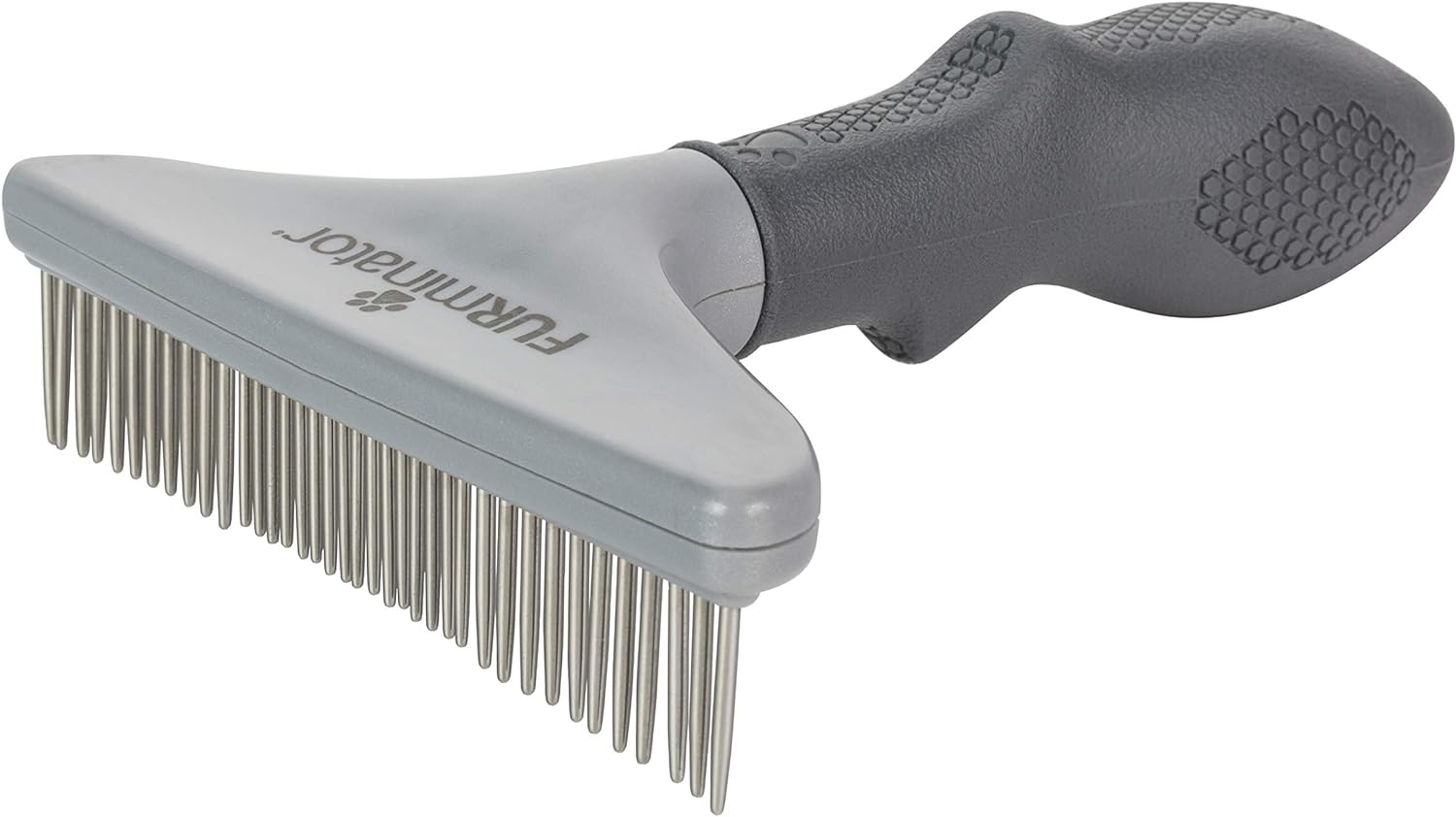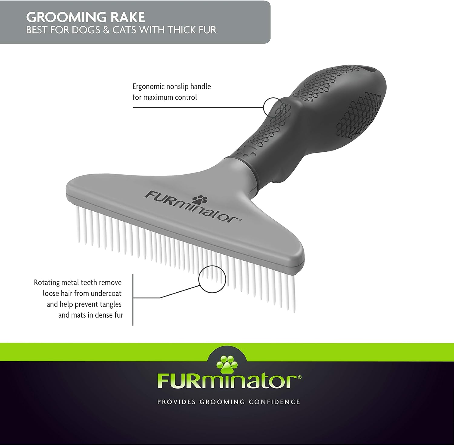 The FURminator® Grooming Rake has rotating metal teeth that remove loose hair from your pet’s undercoat. Best for dogs and cats with thicker fur, the FURminator® Grooming Rake helps prevent tangles and mats. The ergonomic nonslip handle gives you maximum control. Routine maintenance is important to keeping up with your pet and home. The FURminator® Grooming Rake provides a convenient daily solution for undercoat care. For best results, use with other FURminator® grooming products as part of a complete regimen.