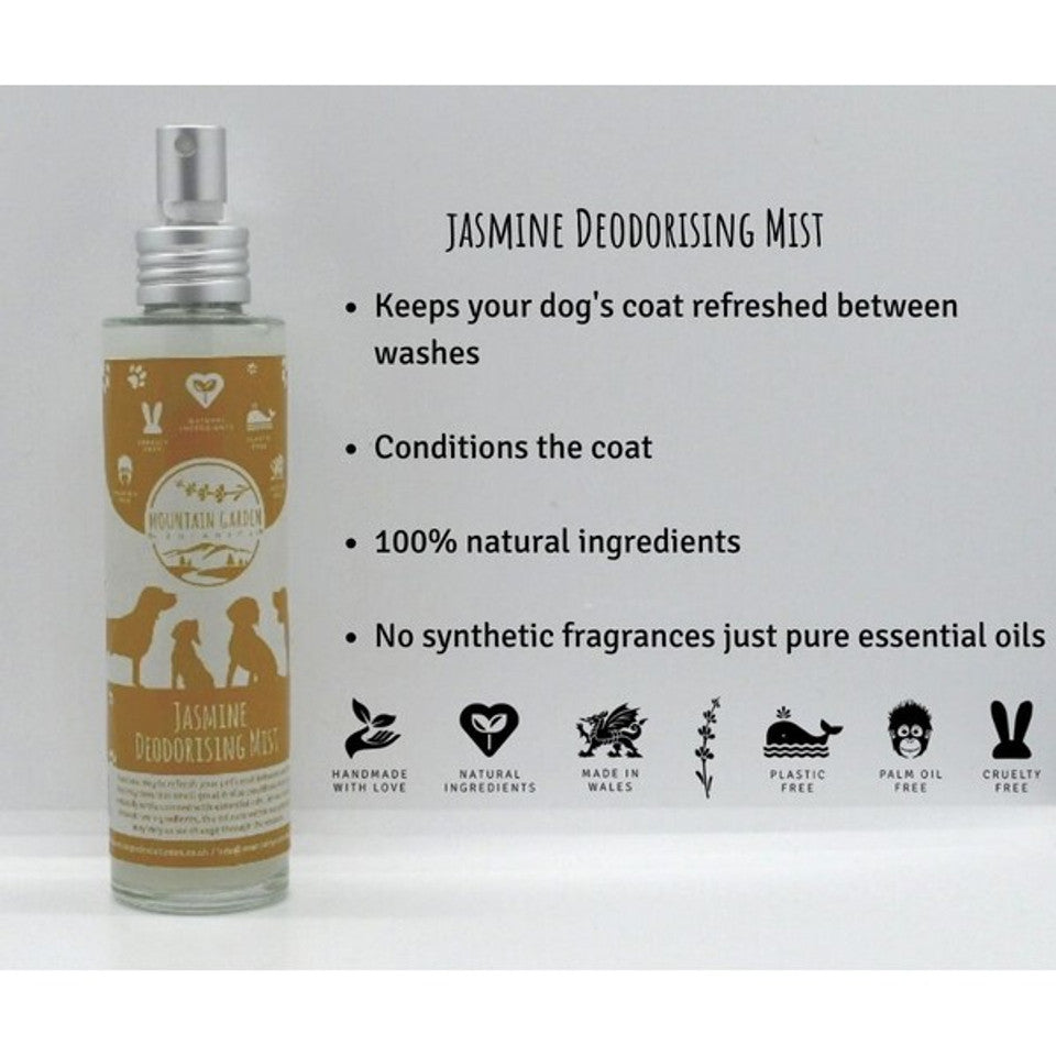 Mountain Garden Botanics deodorising pet mists are a perfect solution to refresh your pet's coat between bath times. Many sprays can be overpowering and suited more to the human nose rather than canine however ours are lightly scented for the most sensitive noses in the pack. We also have conditioning natural enzymes to help keep your pet’s coat in top condition. Made with 100% natural ingredients and beautiful jasmine pure essential oil, cruelty free, 100ml recyclable glass mist bottle, No synthetic fragrances.