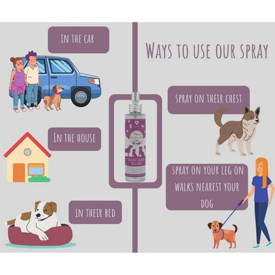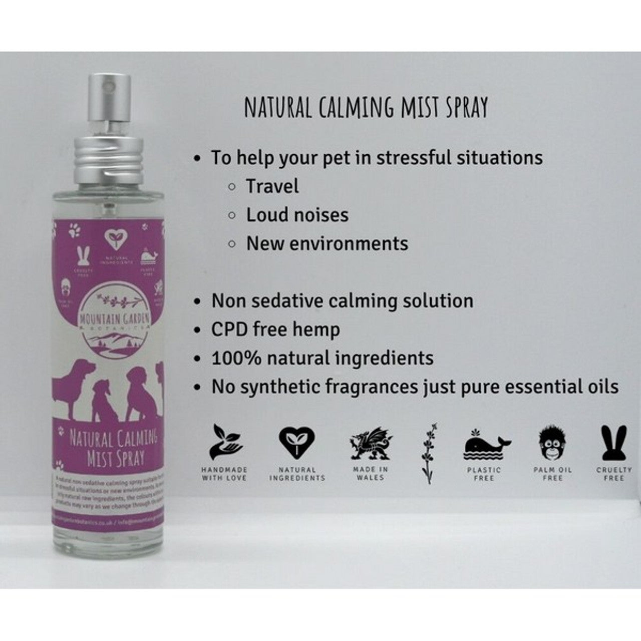 We have a great bond with all our pets at Mountain Garden Botanics and we feel they understand most situations, however sometimes the unexpected can happen to change the environment. In these situations, we wish we could have a conversation to let them know that the sound they hear is a firework or we are having friends over with small children. To help keep your pet calmer in these situations we have created a 100% natural lavender and chamomile calming mist with added CPD free hemp oil. Our calming mist will start to help as soon as you are using it. To clam naturally without sedating. The combination of these active ingredients will help your pet in situations such as: travel anxiety, Loud noises, Change of environment, New pet introduction, Our Lavender and Chamomile Calming Mist is; made using 100% natural ingredients, Cruelty Free, 100ml recyclable glass mist bottle, No synthetic fragrances. Suitable for puppies and kittens from 12 weeks, dogs, cats, horses, and small animals such as rabbits. Spray lightly within the room or on your pets coat as required.