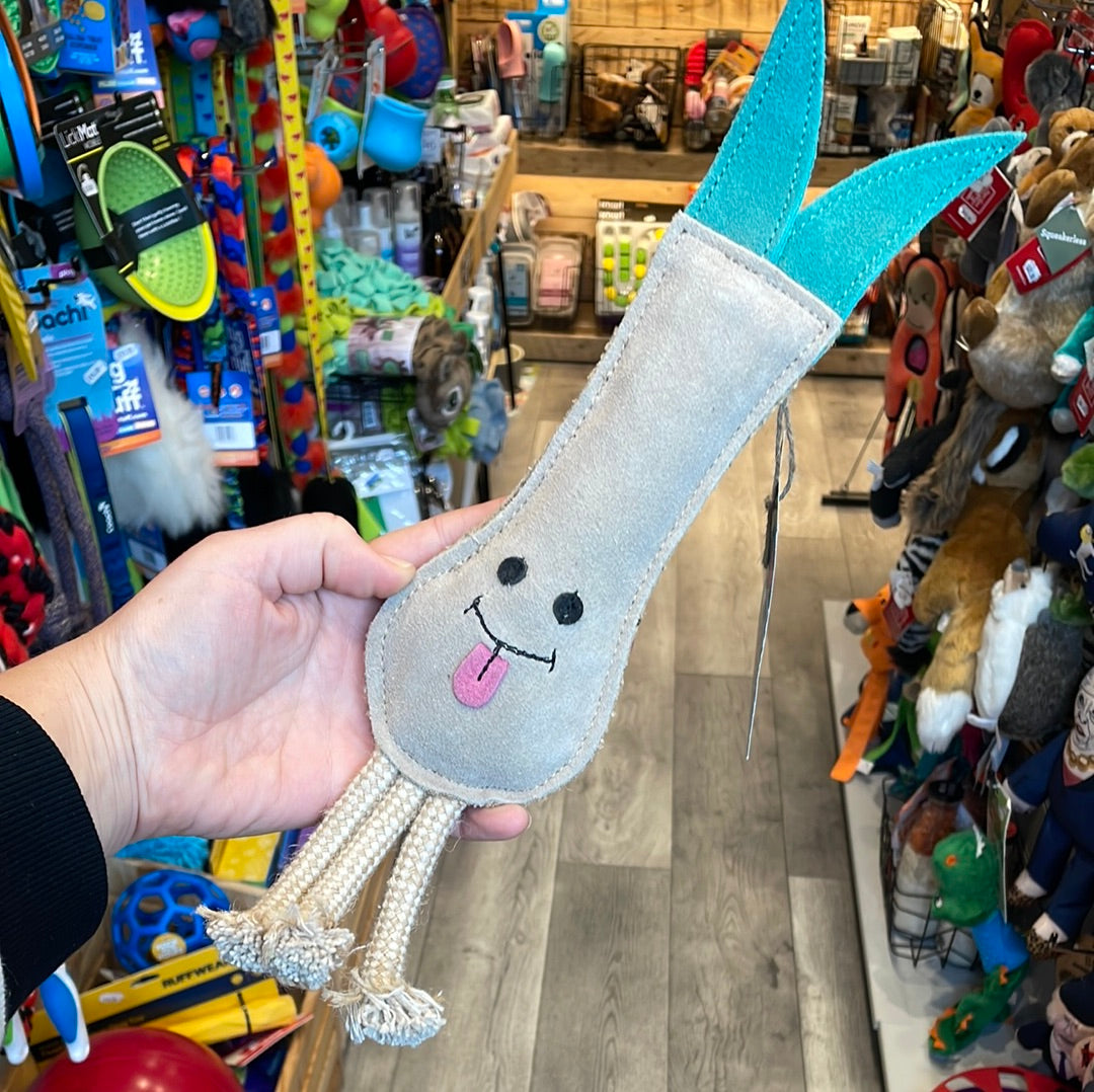 Lenny the Leek is a fun toy made from sustainable jute and covered in soft suede.