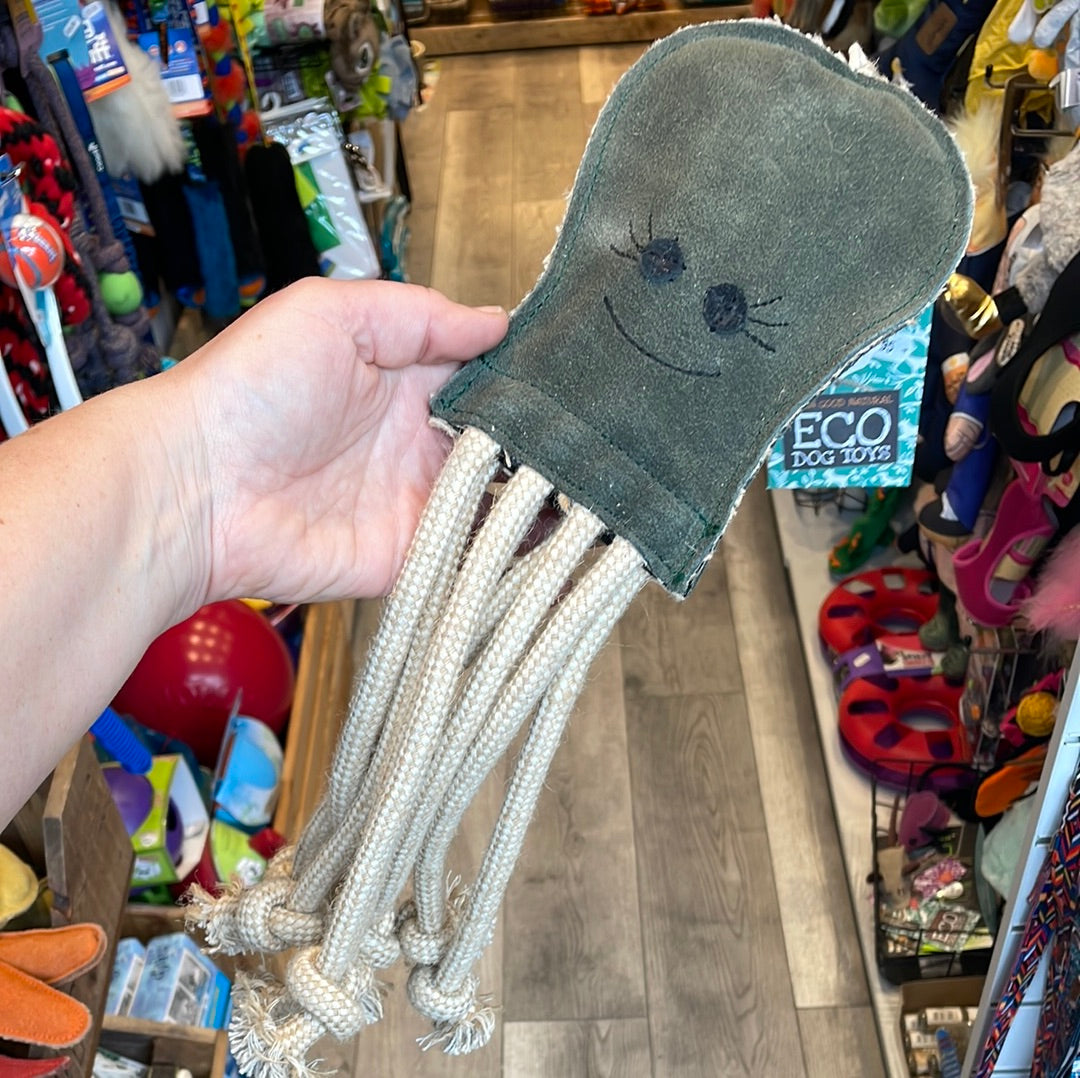 Olive the Octopus - an eco toy for you and your dog to have lots of fun with, whilst being safe in the knowledge that it is made from natural, renewable and recyclable materials.