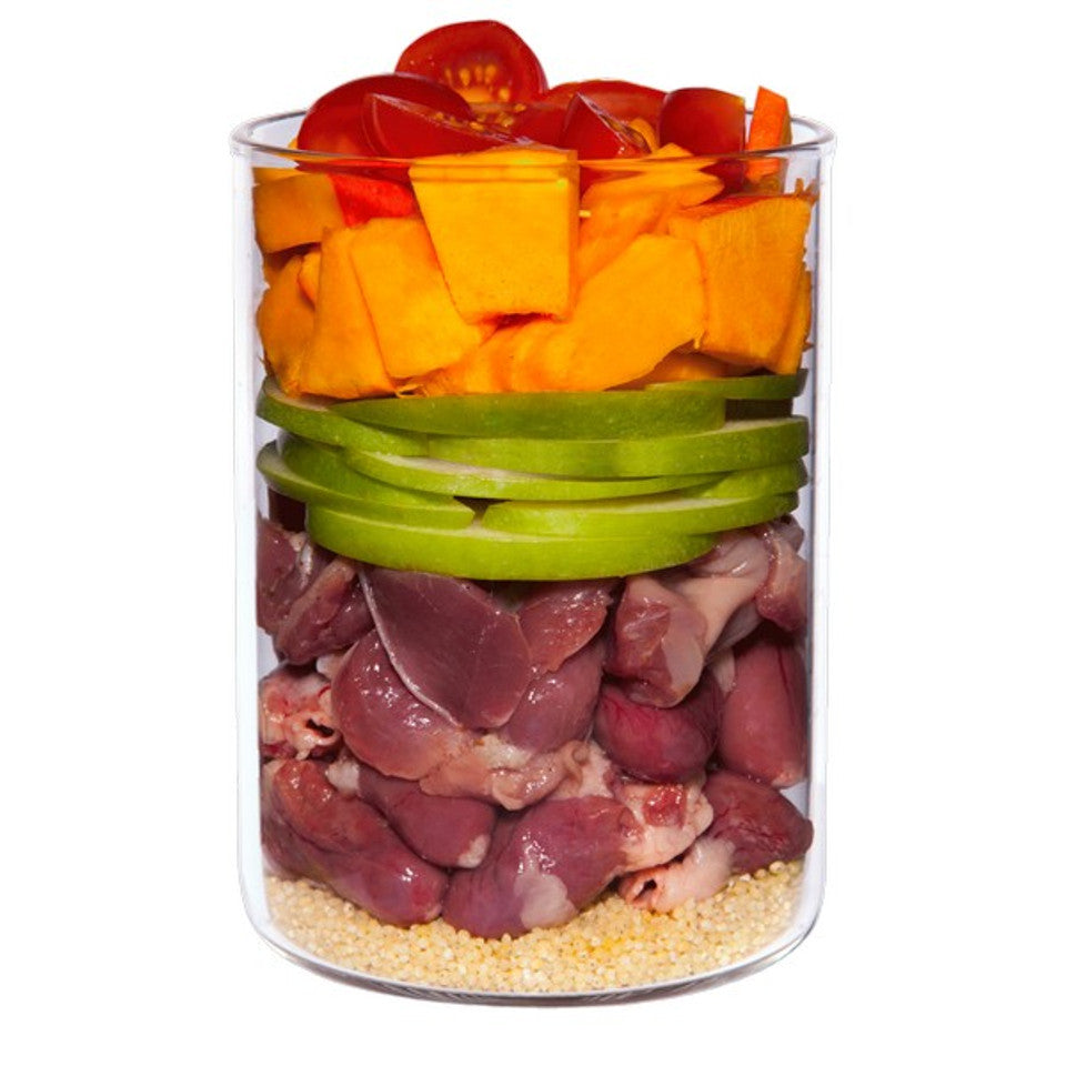 Chicken heart (34%), pumpkin (14%), chicken muscle meat (13%), chicken stomach (13%), tomato, apple, millet, pumpkin seed flour (1%), linseed oil, eggshell powder, brewer’s yeast, seaweed, chives, camomile (0.2%), rose hip powder, mineral clay, pollen (0.04%)